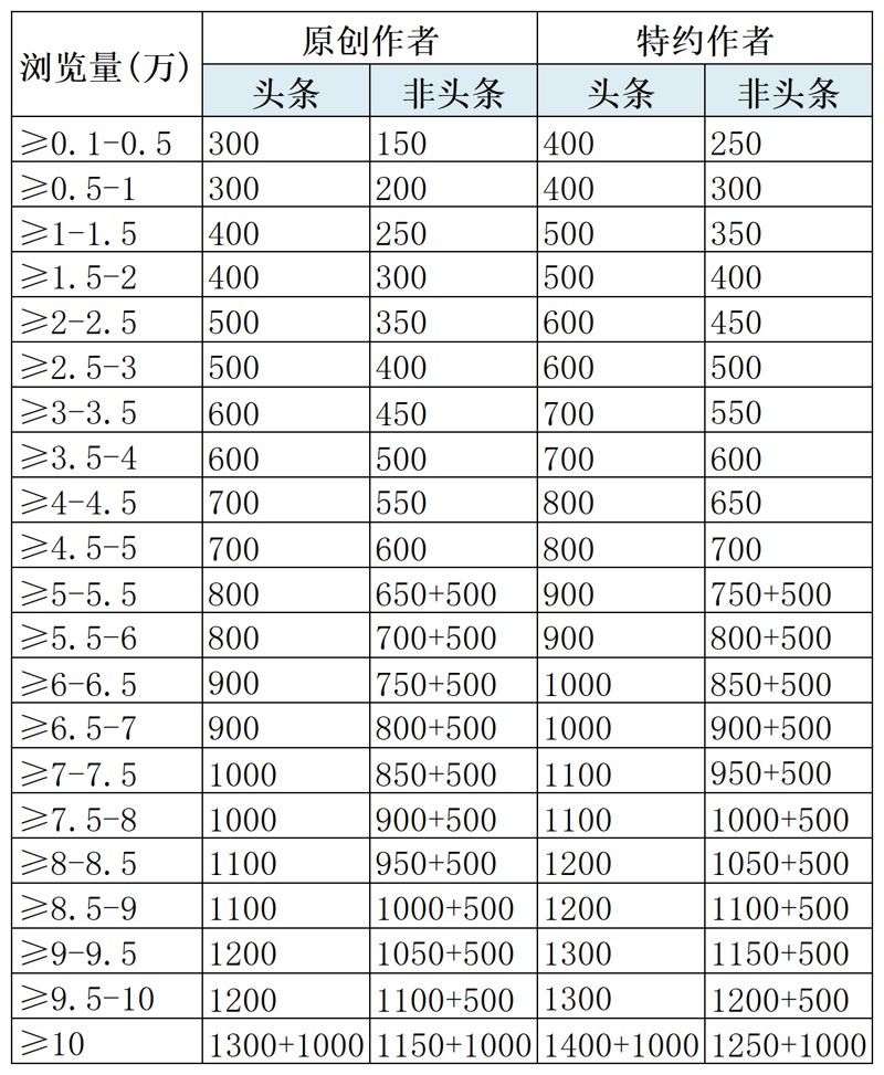 1、头条浏览量10W+或非头条3W+ 1篇及以上;